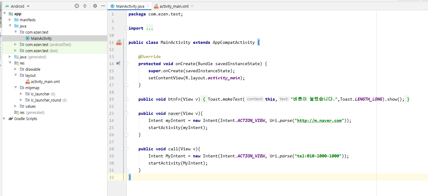 그렇다면 MainActivity.java파일로 이동한다.